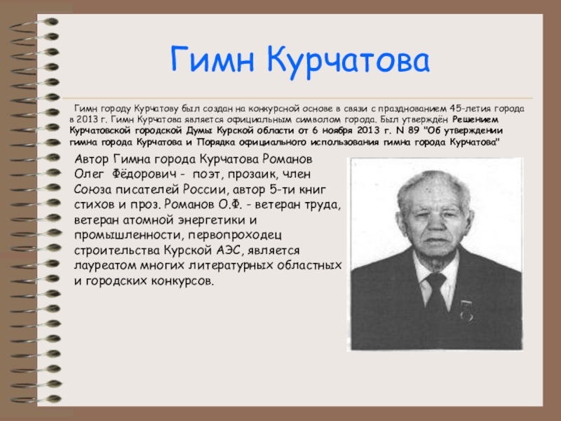 Автор Гимна города Курчатова Романов Олег Фёдорович - поэт, прозаик, член Союза писателей России, автор 5-ти книг стихов и проз. Романов О.Ф. - ветеран труда, ветеран атомной энергетики и промышленности, первопроходец строительства Курской АЭС, является лауреатом многих литературных областных и городских конкурсов.