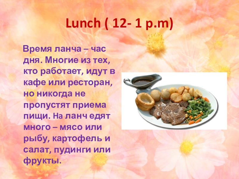 Многие из тех, кто работает, идут в кафе или ресторан, но никогда не пропустят приема пищи. Ha ланч едят много – мясо или рыбу, картофель и салат, пудинги или фрукты.