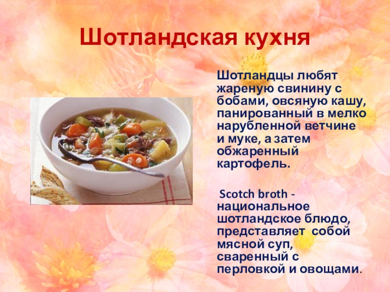 Scotch broth - национальное шотландское блюдо, представляет собой мясной суп, сваренный с перловкой и овощами.