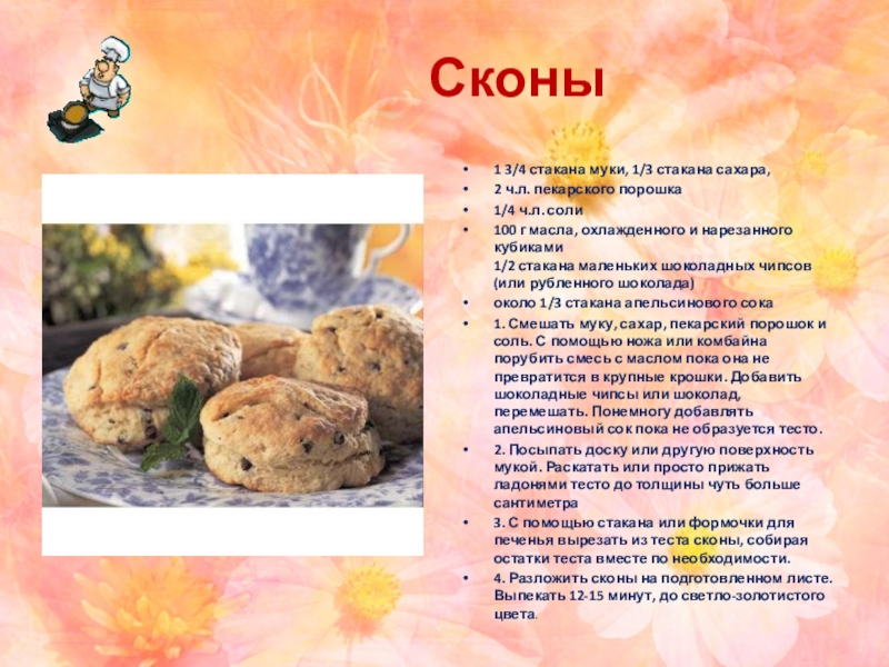 1. Смешать муку, сахар, пекарский порошок и соль. С помощью ножа или комбайна порубить смесь с маслом пока она не превратится в крупные крошки. Добавить шоколадные чипсы или шоколад, перемешать. Понемногу добавлять апельсиновый сок пока не образуется тесто.