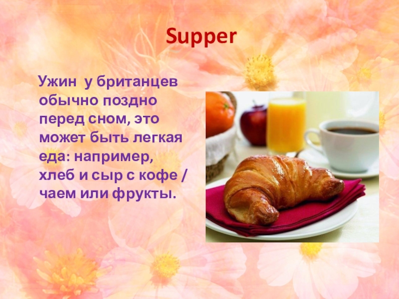 работы. В некоторых домах обед – самый большой прием пищи за день. Он может начаться с супа, затем рыба, жареный цыпленок, картофель с овощами, фрукты, кофе/чай.
