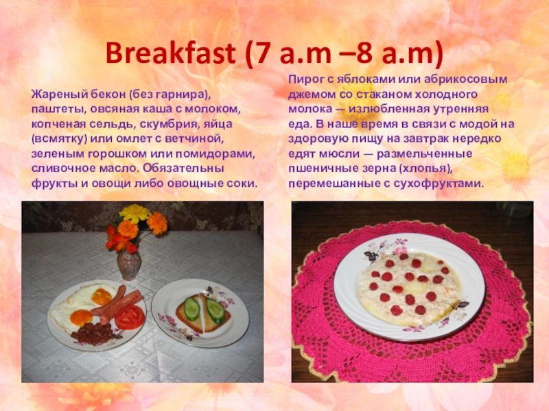 Слайд 6Breakfast (7 a.m –8 a.m)