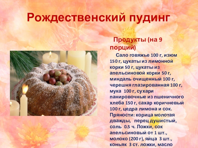 Сало говяжье 100 г, изюм 150 г, цукаты из лимонной корки 50 г, цукаты из апельсиновой корки 50 г, миндаль очищенный 100 г, черешня глазированная 100 г, мука 100 г, сухари панировочные из пшеничного хлеба 150 г, сахар коричневый 100 г, цедра лимона и сок. Пряности: корица молотая дважды, перец душистый, соль 0.5 ч. Ложки, сок апельсиновый от 1 шт., молоко (200 г), яйца 3 шт., коньяк 3 ст. ложки, масло растительное мазать форму.