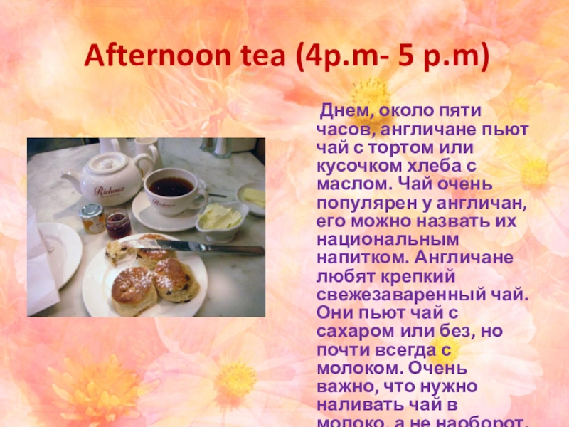 Слайд 14Afternoon tea (4p.m- 5 p.m)