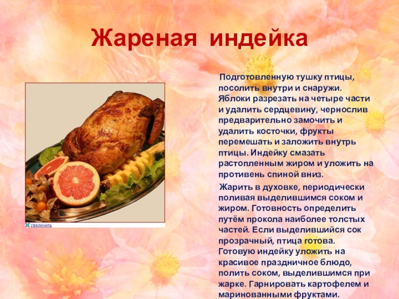 Жарить в духовке, периодически поливая выделившимся соком и жиром. Готовность определить путём прокола наиболее толстых частей. Если выделившийся сок прозрачный, птица готова. Готовую индейку уложить на красивое праздничное блюдо, полить соком, выделившимся при жарке. Гарнировать картофелем и маринованными фруктами.