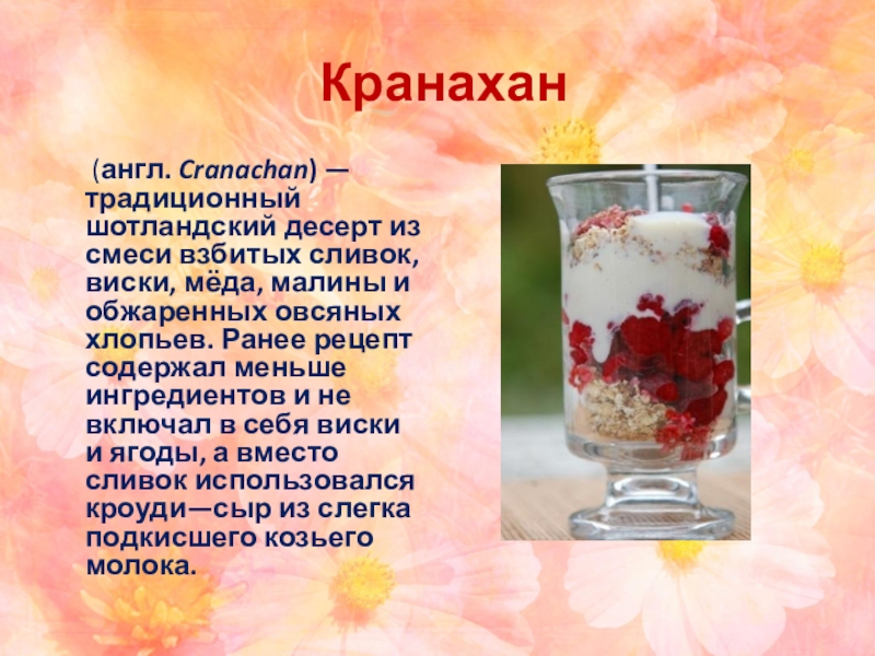 смеси взбитых сливок, виски, мёда, малины и обжаренных овсяных хлопьев. Ранее рецепт содержал меньше ингредиентов и не включал в себя виски и ягоды, а вместо сливок использовался кроуди—сыр из слегка подкисшего козьего молока.