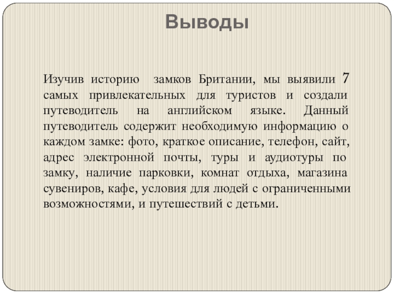 и создали путеводитель на английском языке. Данный путеводитель содержит необходимую информацию о каждом замке: фото, краткое описание, телефон, сайт, адрес электронной почты, туры и аудиотуры по замку, наличие парковки, комнат отдыха, магазина сувениров, кафе, условия для людей с ограниченными возможностями, и путешествий с детьми.