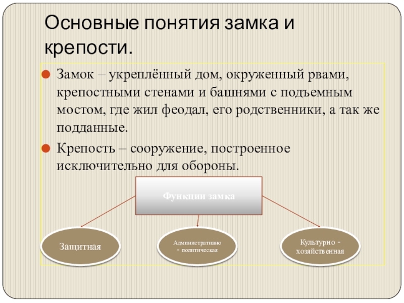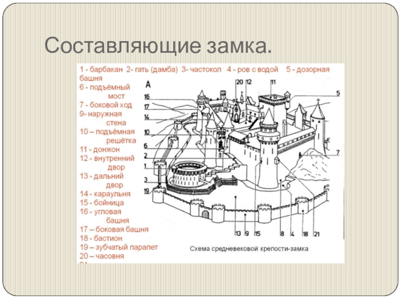 стенами и башнями с подъемным мостом, где жил феодал, его родственники, а так же подданные.