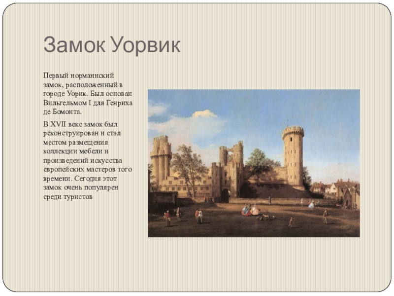 Первый норманнский замок, расположенный в городе Уорик. Был основан Вильгельмом I