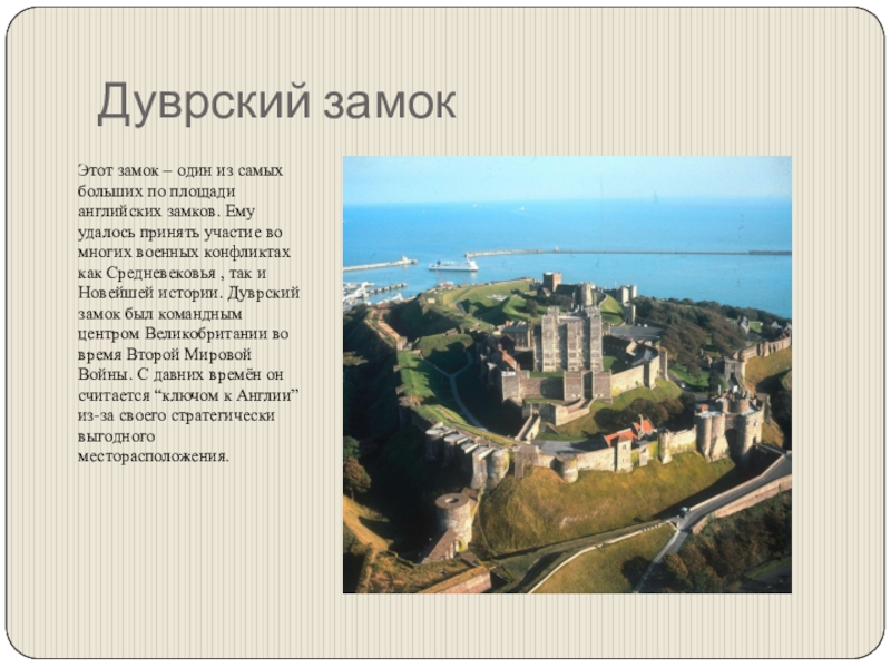 замков. Ему удалось принять участие во многих военных конфликтах как Средневековья , так и Новейшей истории. Дуврский замок был командным центром Великобритании во время Второй Мировой Войны. С давних времён он считается “ключом к Англии”из-за своего стратегически выгодного месторасположения.