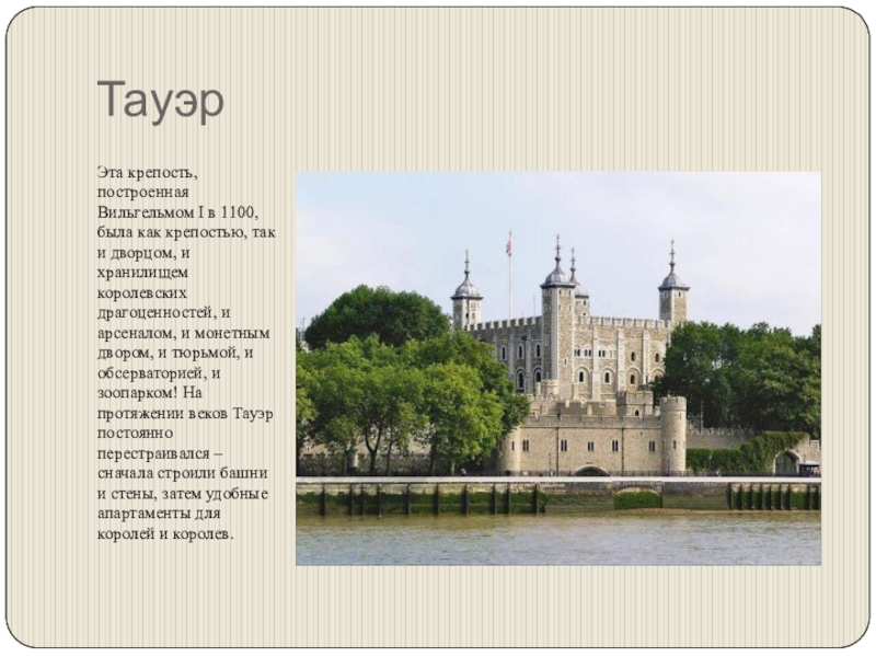 и дворцом, и хранилищем королевских драгоценностей, и арсеналом, и монетным двором, и тюрьмой, и обсерваторией, и зоопарком! На протяжении веков Тауэр постоянно перестраивался – сначала строили башни и стены, затем удобные апартаменты для королей и королев.