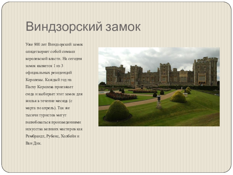 На сегодня замок является 1 из 3 официальных резиденций Королевы. Каждый год на Пасху Королева приезжает сюда и выбирает этот замок для жилья в течение месяца (с марта по апрель). Так же тысячи туристов могут полюбоваться произведениями искусства великих мастеров как Рембрандт, Рубенс, Холбейн и Ван Дик.