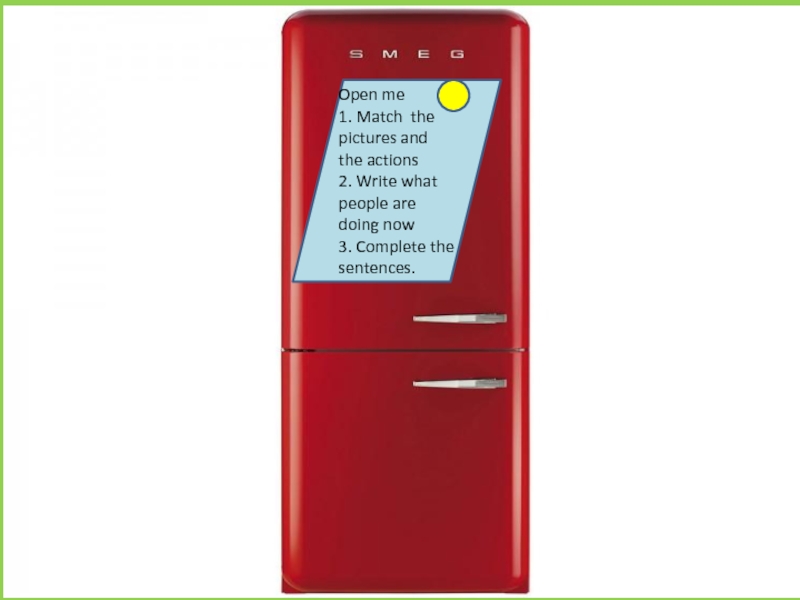 Open me1. Match the pictures and the actions2. Write what people are doing now3. Complete the sentences.