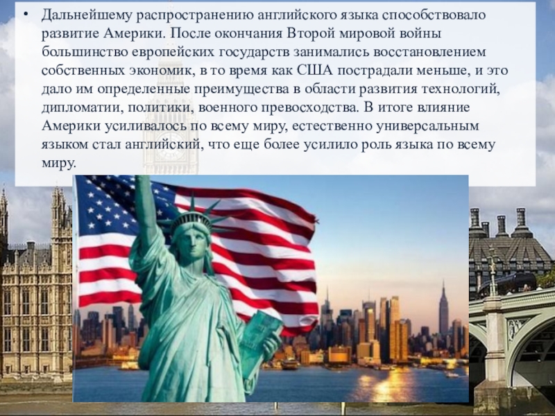 Слайд 5Дальнейшему распространению английского языка способствовало развитие Америки. После окончания Второй мировой