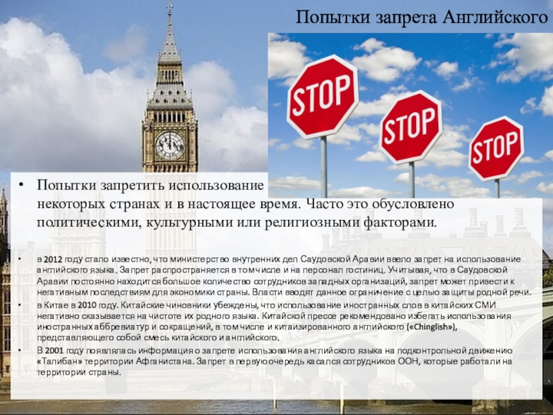 В 2001 году появлялась информация о запрете использования английского языка на подконтрольной движению «Талибан» территории Афганистана. Запрет в первую очередь касался сотрудников ООН, которые работали на территории страны.