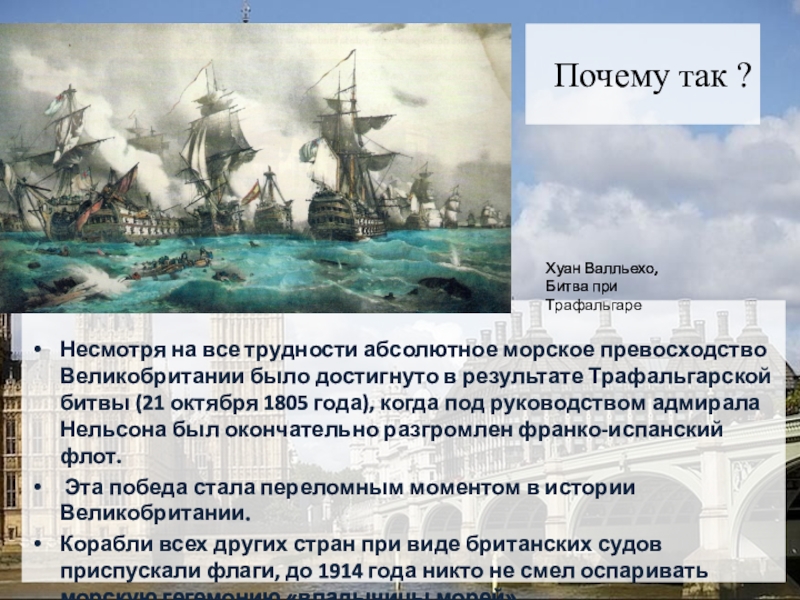 достигнуто в результате Трафальгарской битвы (21 октября 1805 года), когда под руководством адмирала Нельсона был окончательно разгромлен франко-испанский флот.