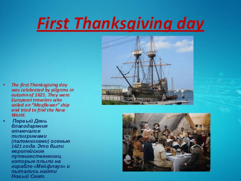 Первый День благодарения отмечался пилигримами (паломниками) осенью 1621 года. Это были европейские путешественники, которые плыли на корабле «Мейфлауэ» и пытались найти Новый Свет.