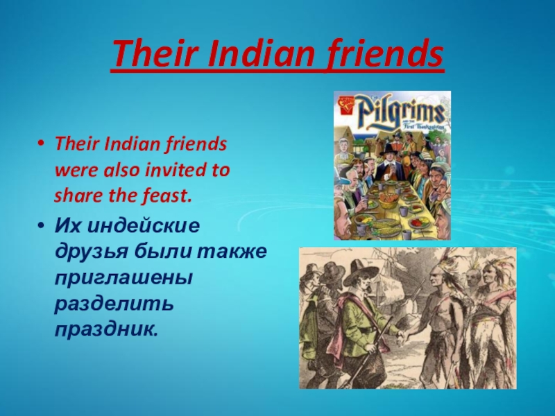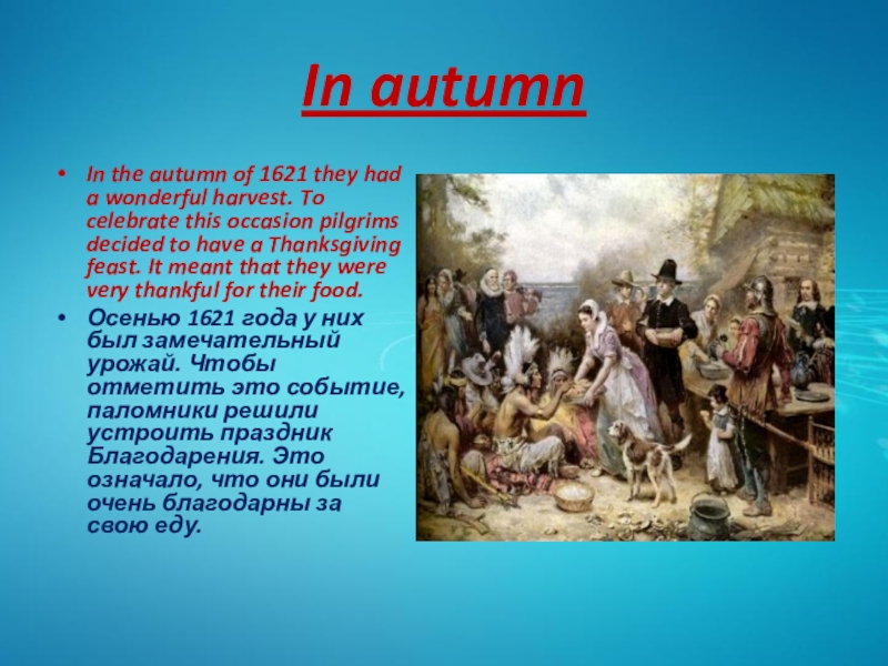 Осенью 1621 года у них был замечательный урожай. Чтобы отметить это событие, паломники решили устроить праздник Благодарения. Это означало, что они были очень благодарны за свою еду.