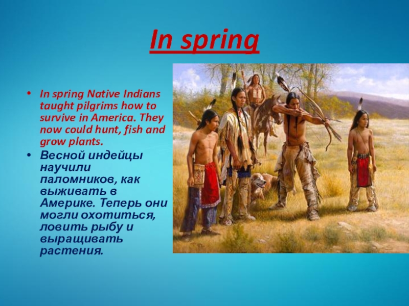Весной индейцы научили паломников, как выживать в Америке. Теперь они могли охотиться, ловить рыбу и выращивать растения.