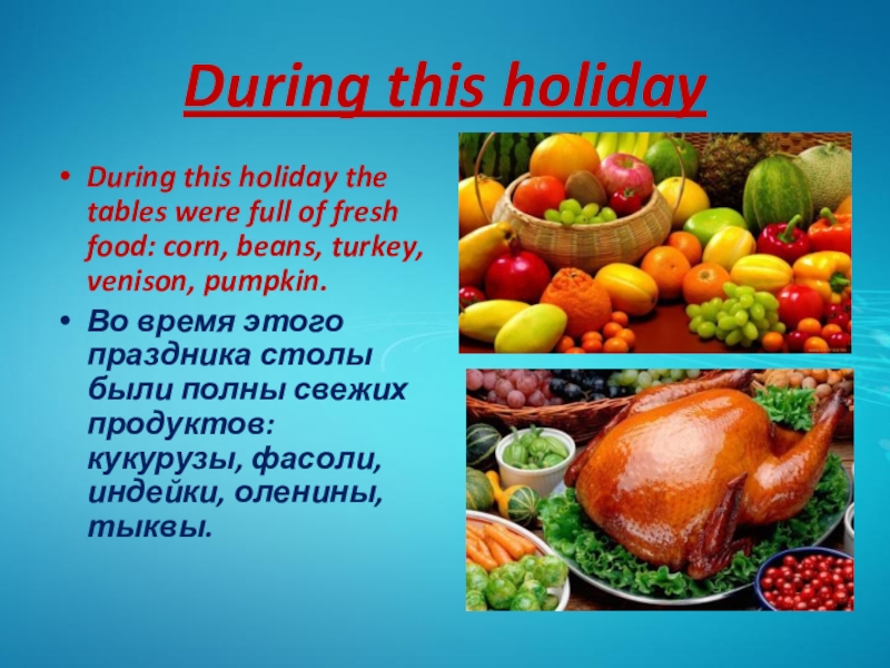 Во время этого праздника столы были полны свежих продуктов: кукурузы, фасоли, индейки, оленины, тыквы.