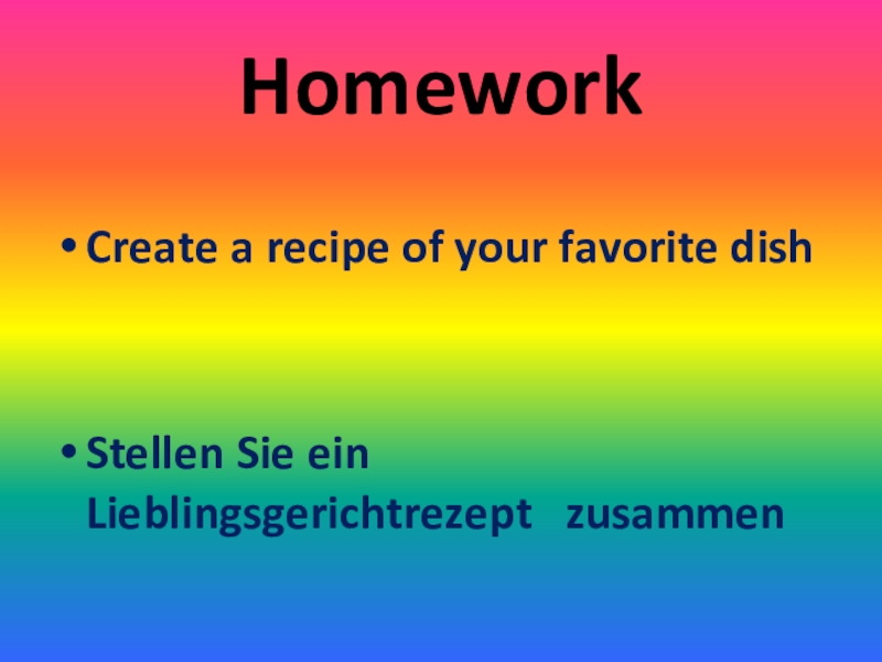 HomeworkCreate a recipe of your favorite dishStellen Sie ein Lieblingsgerichtrezept  zusammen