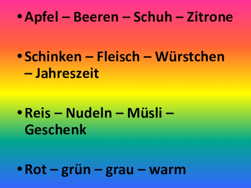 Apfel – Beeren – Schuh – ZitroneSchinken – Fleisch – Würstchen – JahreszeitReis – Nudeln – Müsli