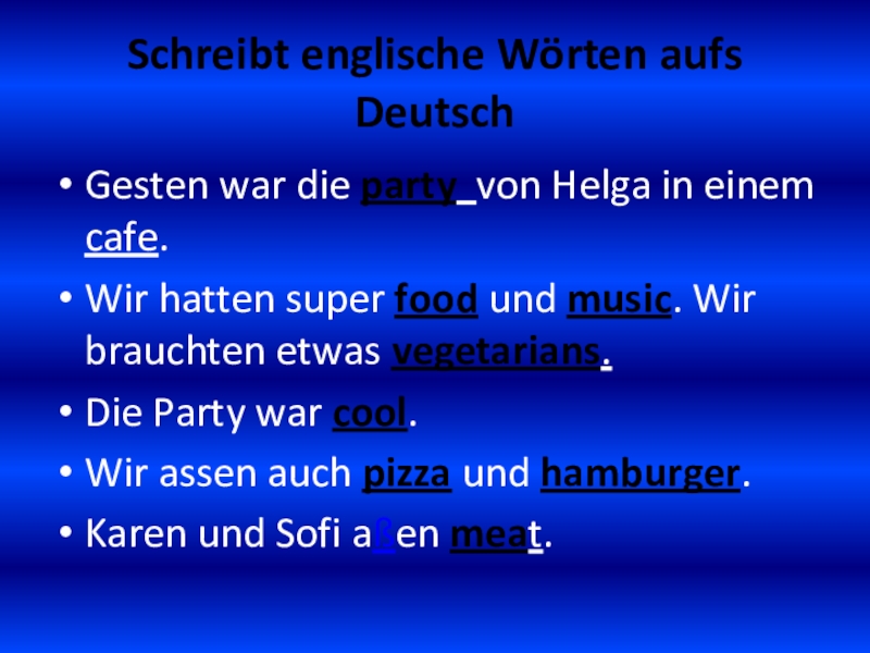 Schreibt englische Wörten aufs DeutschGesten war die party von Helga in einem cafe. Wir hatten super food