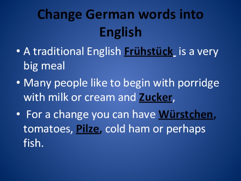 Change German words into EnglishA traditional English Frühstück is a very big mealMany people like to begin