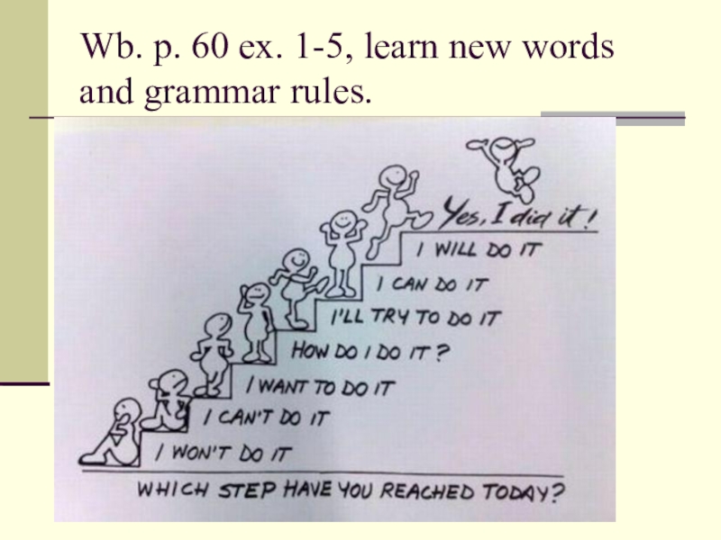 Слайд 13Wb. p. 60 ex. 1-5, learn new words and grammar rules.