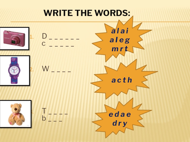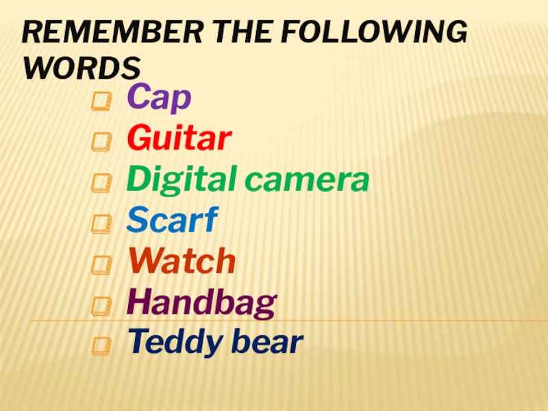 Remember the following wordsCapGuitarDigital cameraScarfWatchHandbagTeddy bear