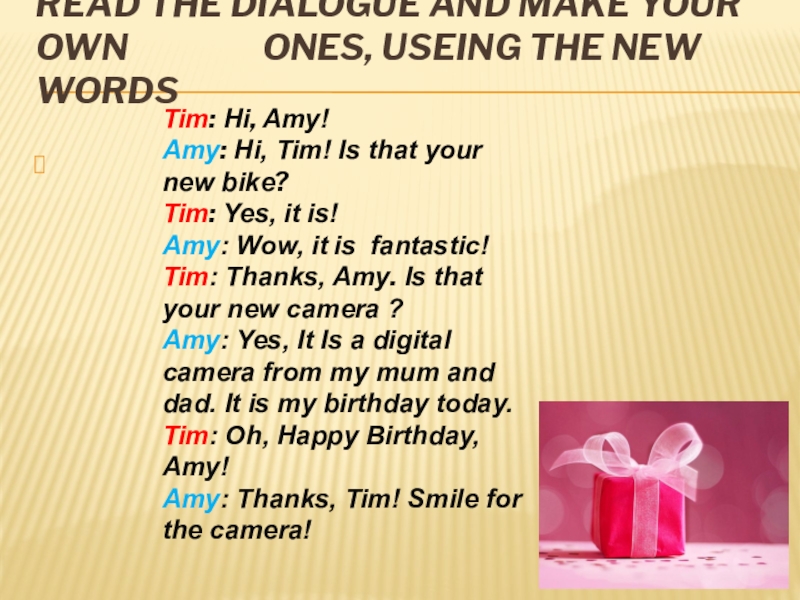 Tim: Hi, Amy! Amy: Hi, Tim! Is that your new bike? Tim: Yes, it is! Amy: Wow, it is fantastic! Tim: Thanks, Amy. Is that your new camera ? Amy: Yes, It Is a digital camera from my mum and dad. It is my birthday today. Tim: Oh, Happy Birthday, Amy! Amy: Thanks, Tim! Smile for the camera!