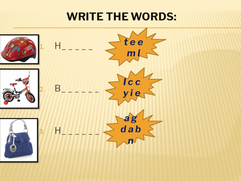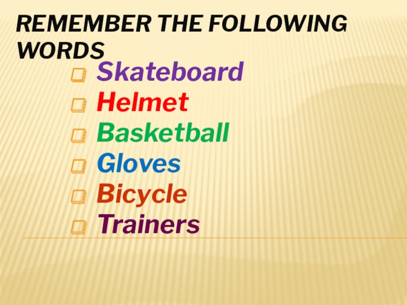 Remember the following wordsSkateboard HelmetBasketballGloves BicycleTrainers
