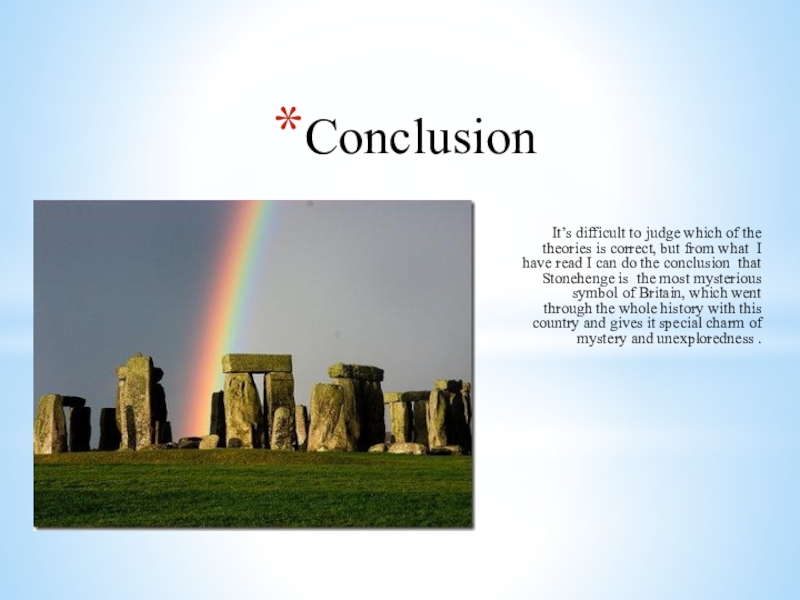 from what I have read I can do the conclusion that Stonehenge is the most mysterious symbol of Britain, which went through the whole history with this country and gives it special charm of mystery and unexploredness .