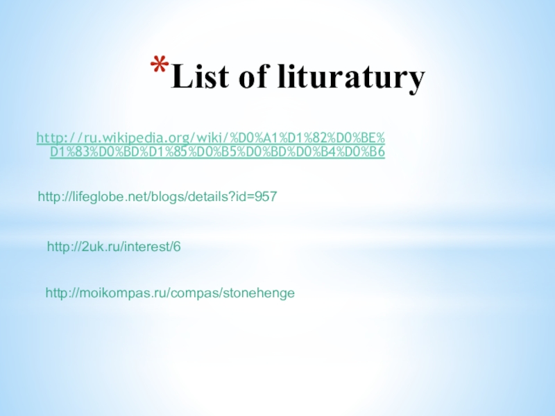 List of lituraturyhttp://ru.wikipedia.org/wiki/%D0%A1%D1%82%D0%BE%D1%83%D0%BD%D1%85%D0%B5%D0%BD%D0%B4%D0%B6http://lifeglobe.net/blogs/details?id=957http://2uk.ru/interest/6http://moikompas.ru/compas/stonehenge