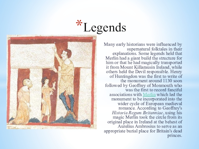 LegendsMany early historians were influenced by supernatural folktales in their explanations. Some legends held that Merlin had