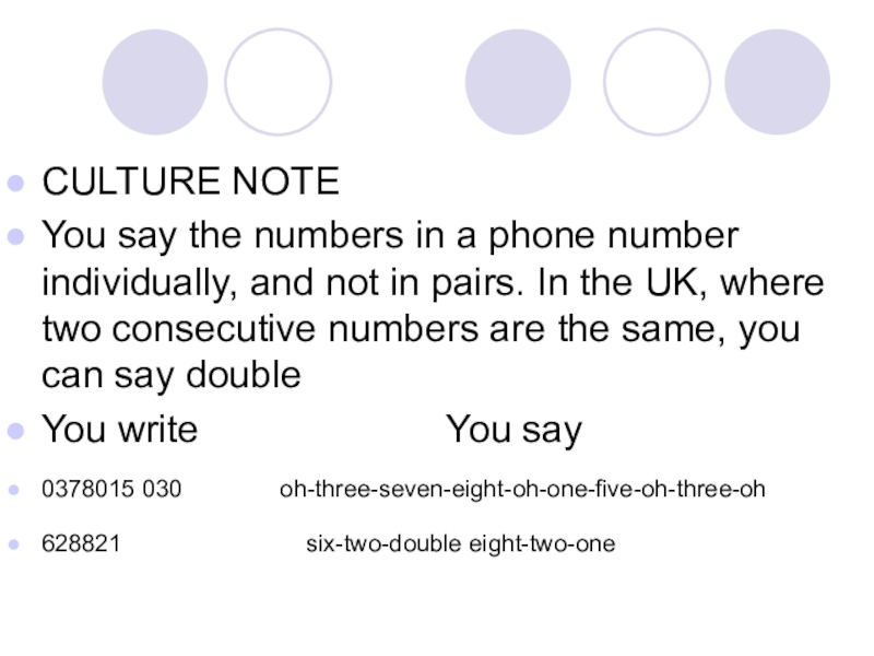 CULTURE NOTEYou say the numbers in a phone number individually, and not in pairs. In the UK, where two consecutive numbers are the same, you can say doubleYou write