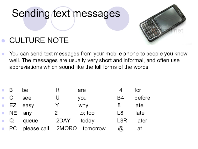 mobile phone to people you know well. The messages are usually very short and informal, and often use abbreviations which sound like the full forms of the words