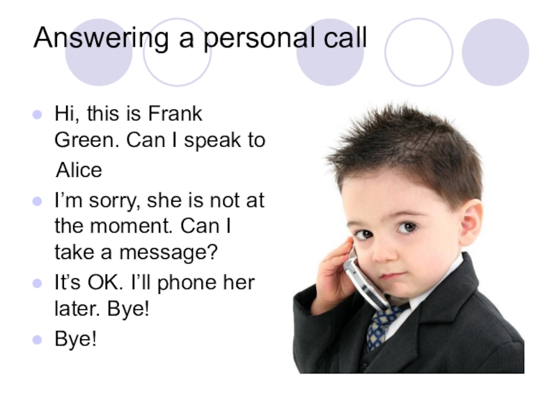 Answering a personal callHi, this is Frank Green. Can I speak to  AliceI’m sorry, she is
