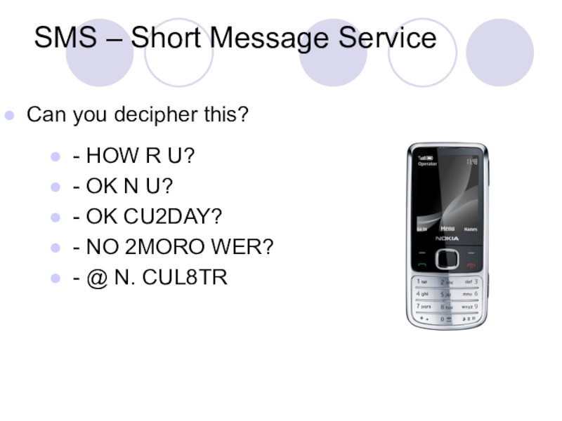 SMS – Short Message ServiceCan you decipher this?- HOW R U?- OK N U?- OK CU2DAY?- NO