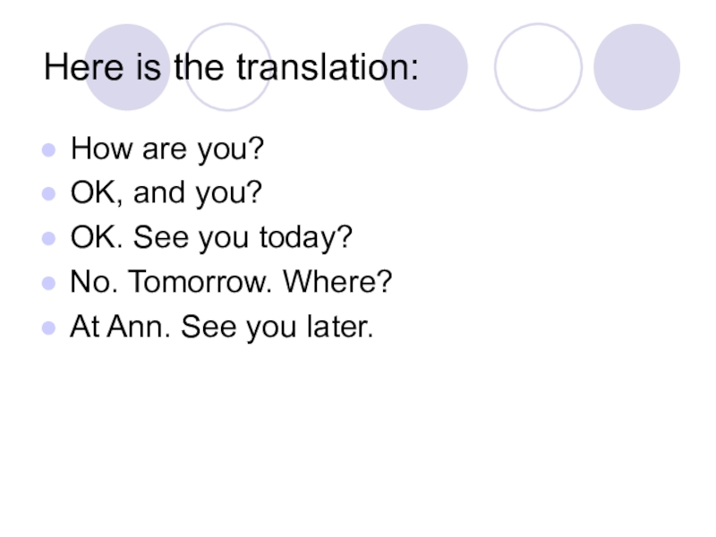 Here is the translation:How are you?OK, and you?OK. See you today?No. Tomorrow. Where?At Ann. See you later.