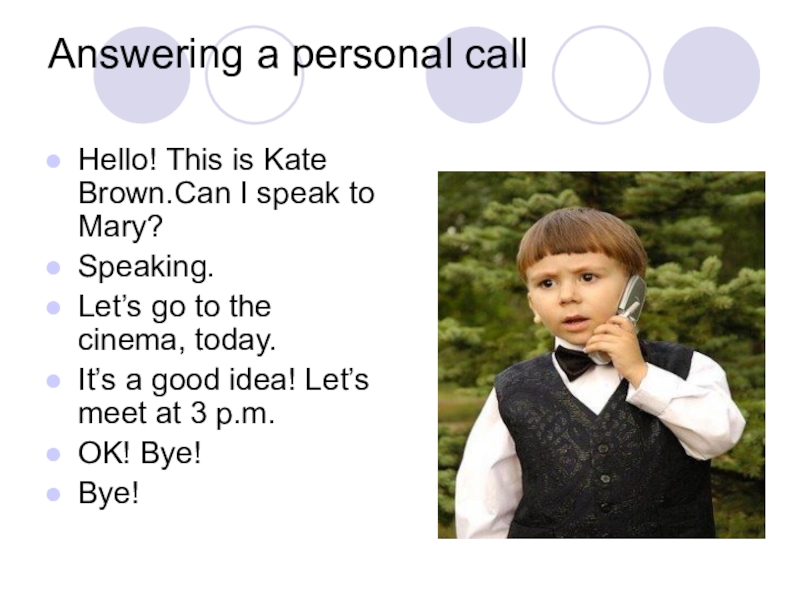 Answering a personal call Hello! This is Kate Brown.Can I speak to Mary?Speaking.Let’s go to the cinema,