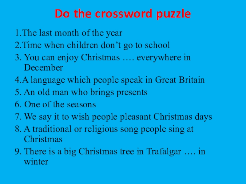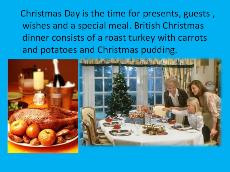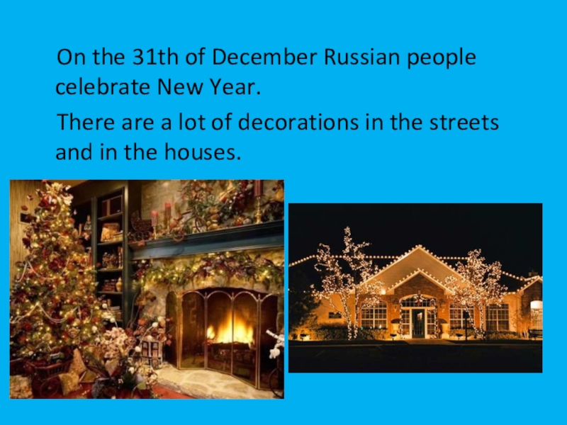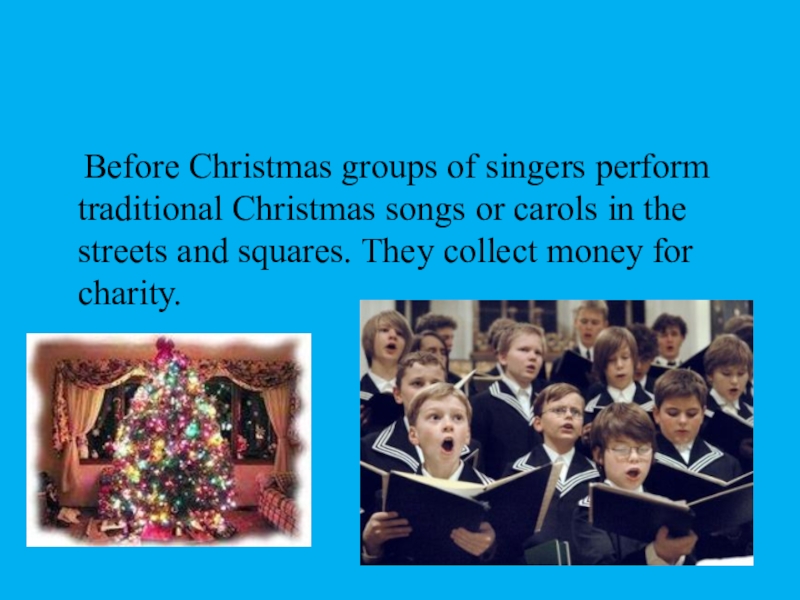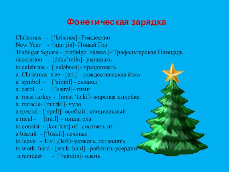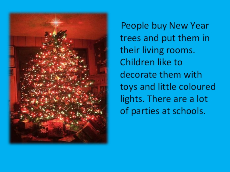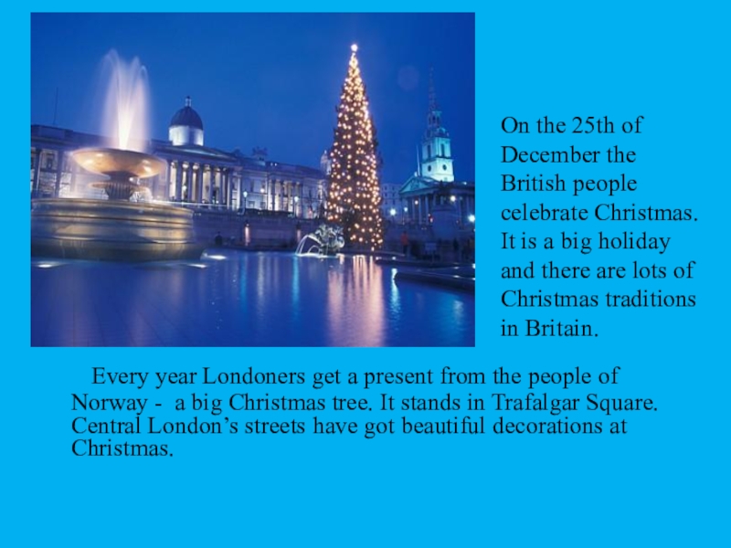 Every year Londoners get a present from the people of Norway - a big Christmas tree. It stands in Trafalgar Square. Central London’s streets have got beautiful decorations at Christmas.