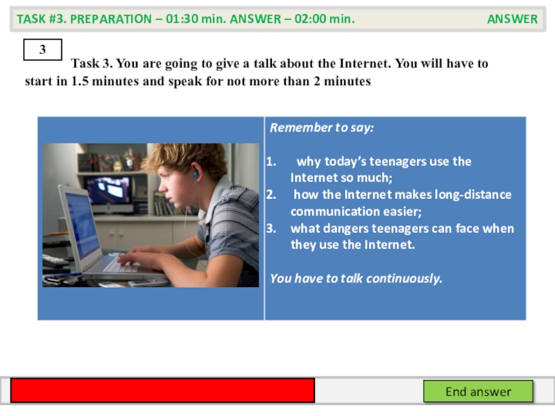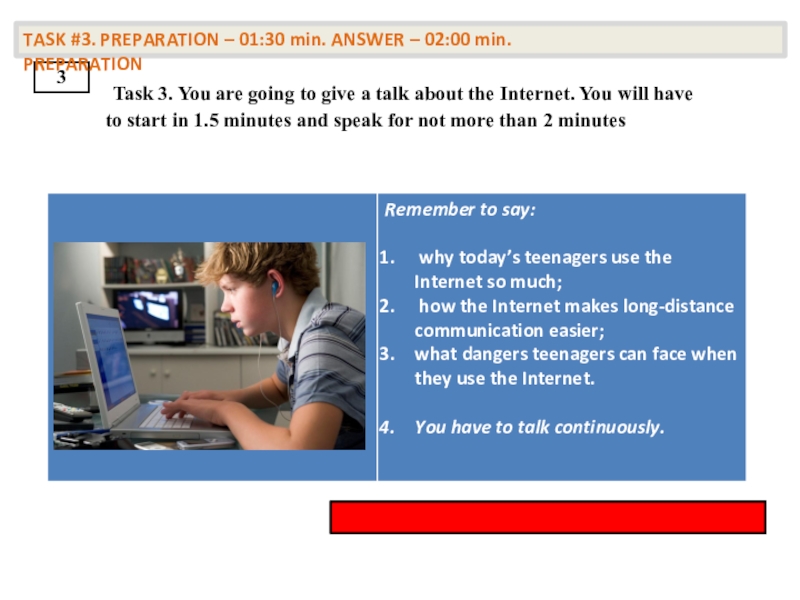 Task 3. You are going to give a talk about the Internet. You will have to start in 1.5 minutes and speak for not more than 2 minutes