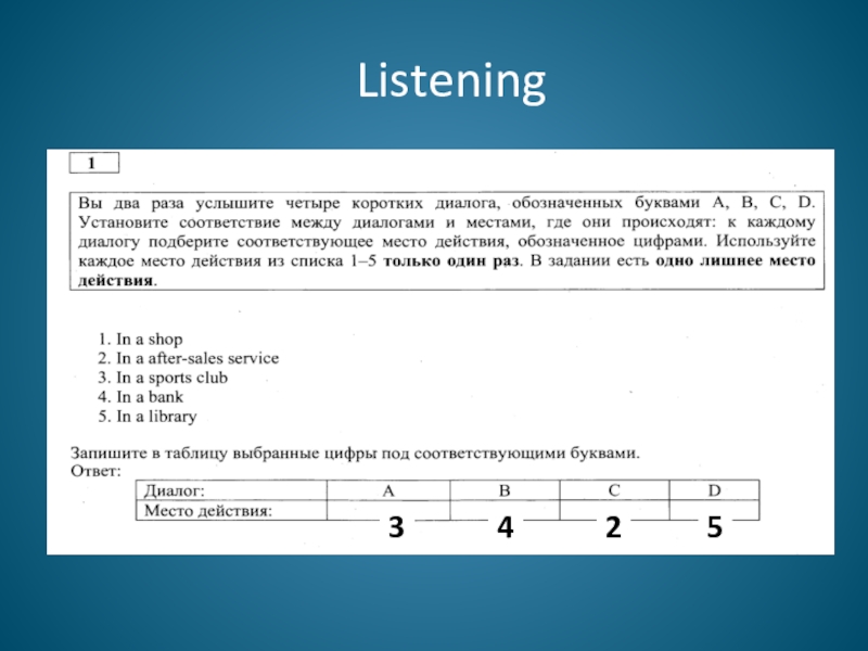 Вы услышите 4 диалога А В С D. Определите, где происходит каждый диалог. Есть одно лишнее высказывание.