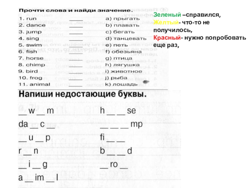 Зеленый –справился,Желтый- что-то не получилось,Красный- нужно попробовать еще раз,