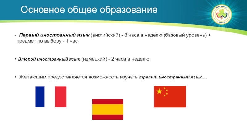 Первый иностранный язык (английский) - 3 часа в неделю (базовый уровень) + предмет по выбору - 1