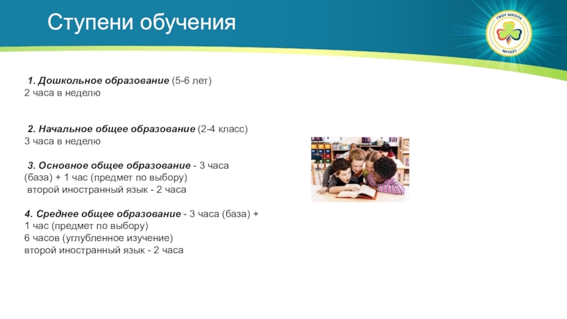 1. Дошкольное образование2. Начальное общее образование 3. Основное общее образование 4. Среднее общее образование -