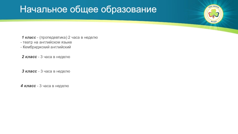 1 класс - (пропедевтика) 2 часа в неделю 2 класс3 класс 4 класс