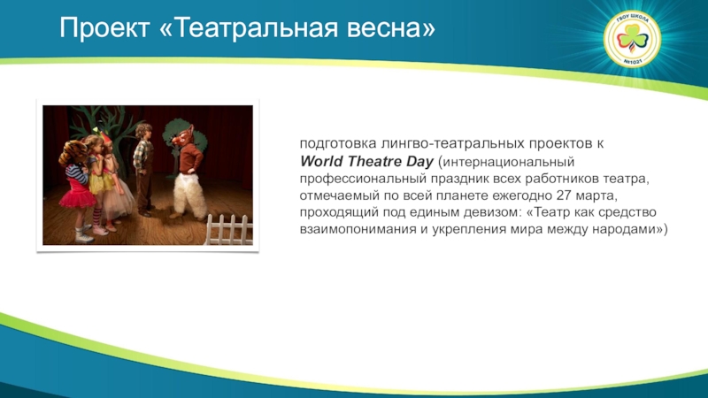 World Theatre Day интернациональный профессиональный праздник всех работников театра, отмечаемый по всей планете ежегодно 27 марта, проходящий