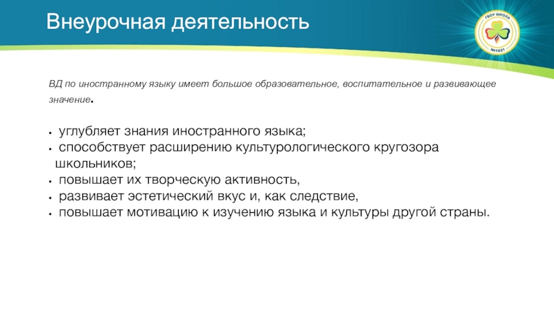 ВД по иностранному языку имеет большое образовательное, воспитательное и развивающее значение